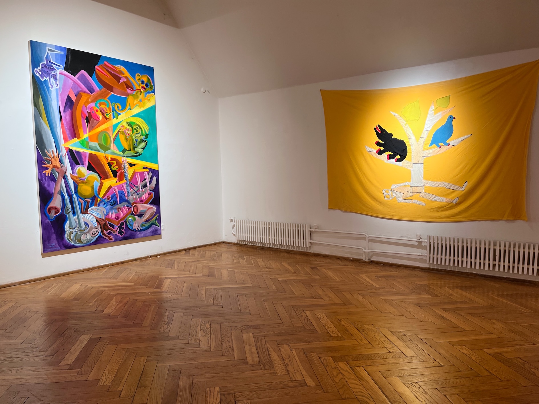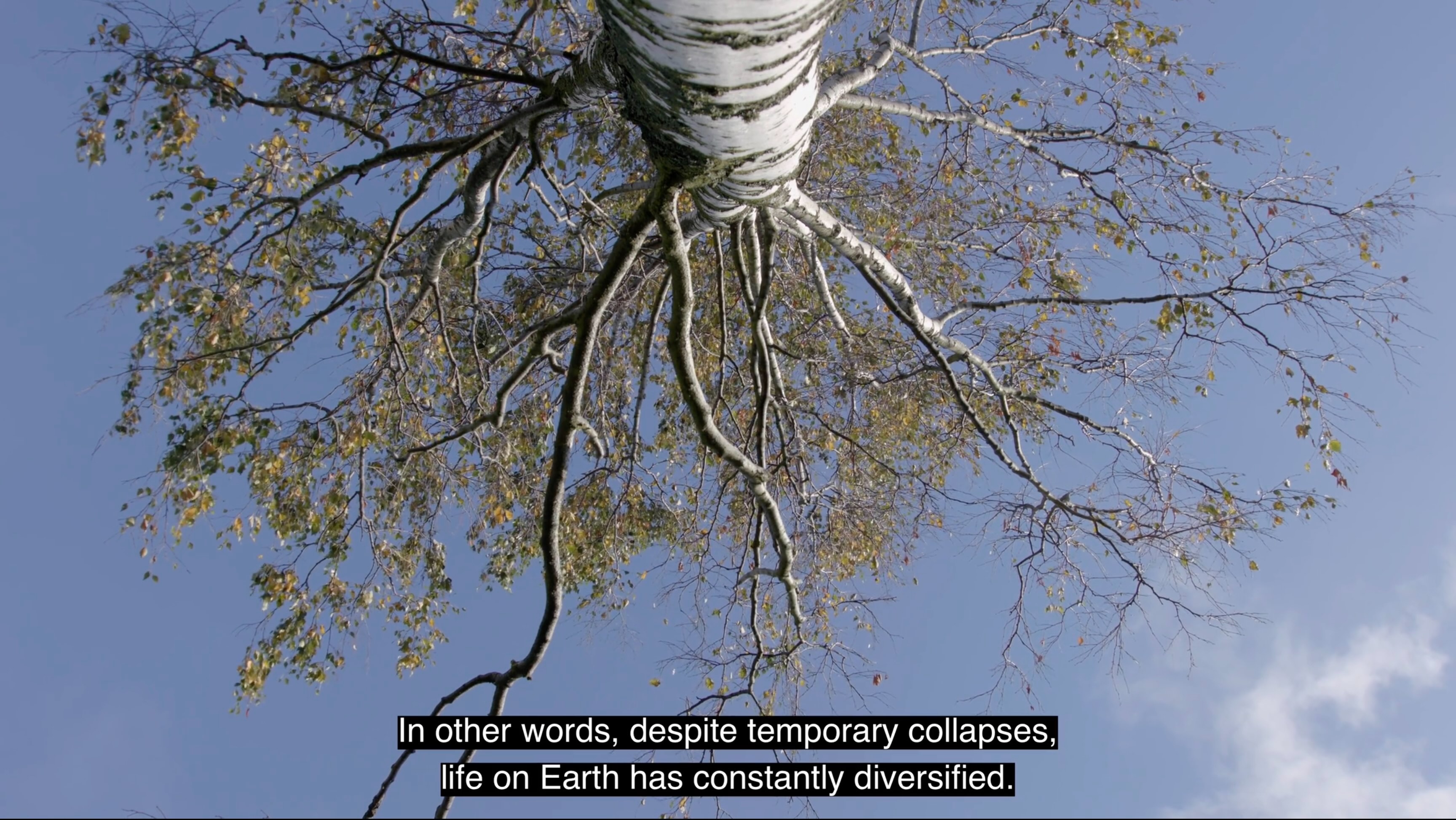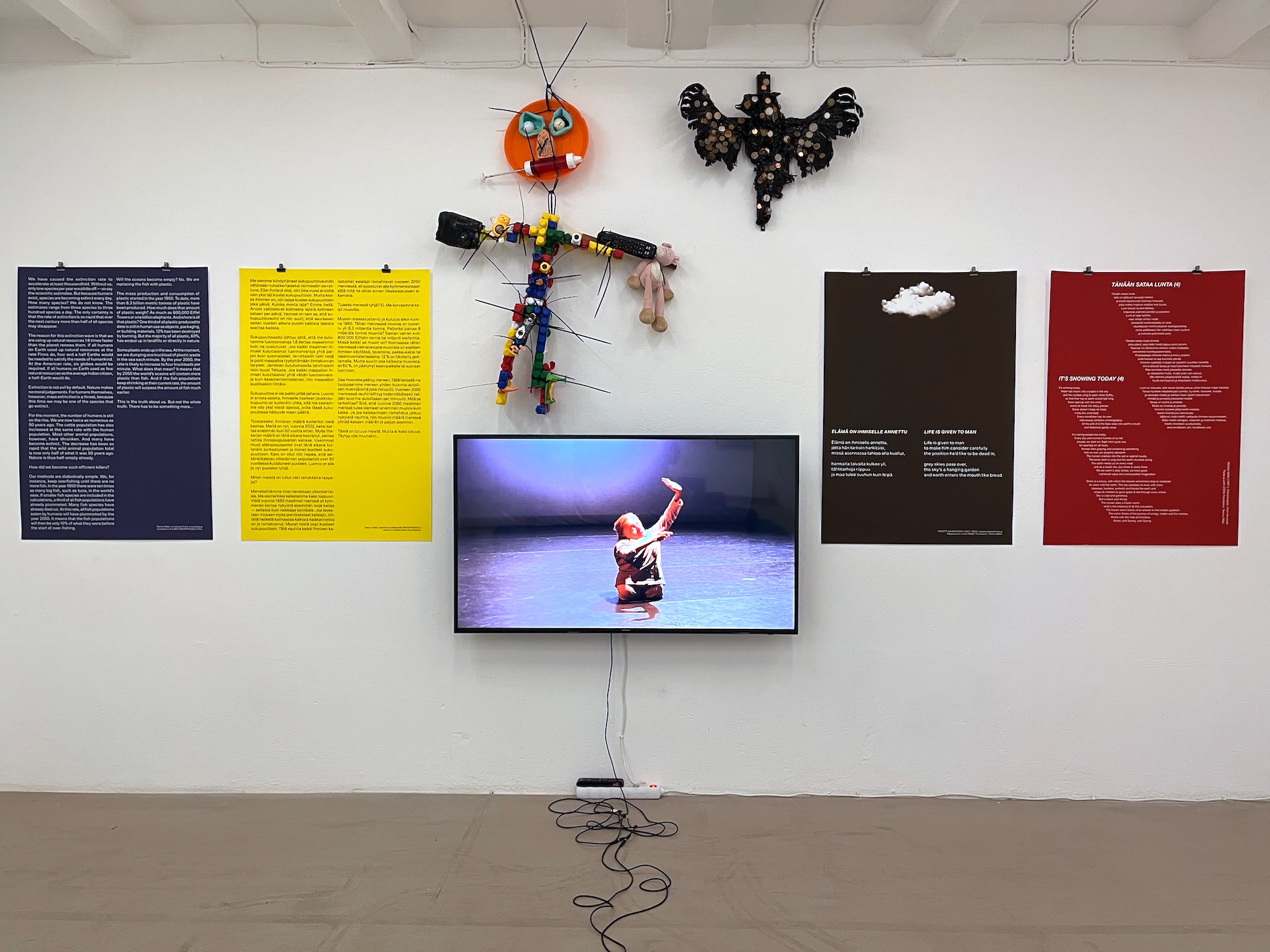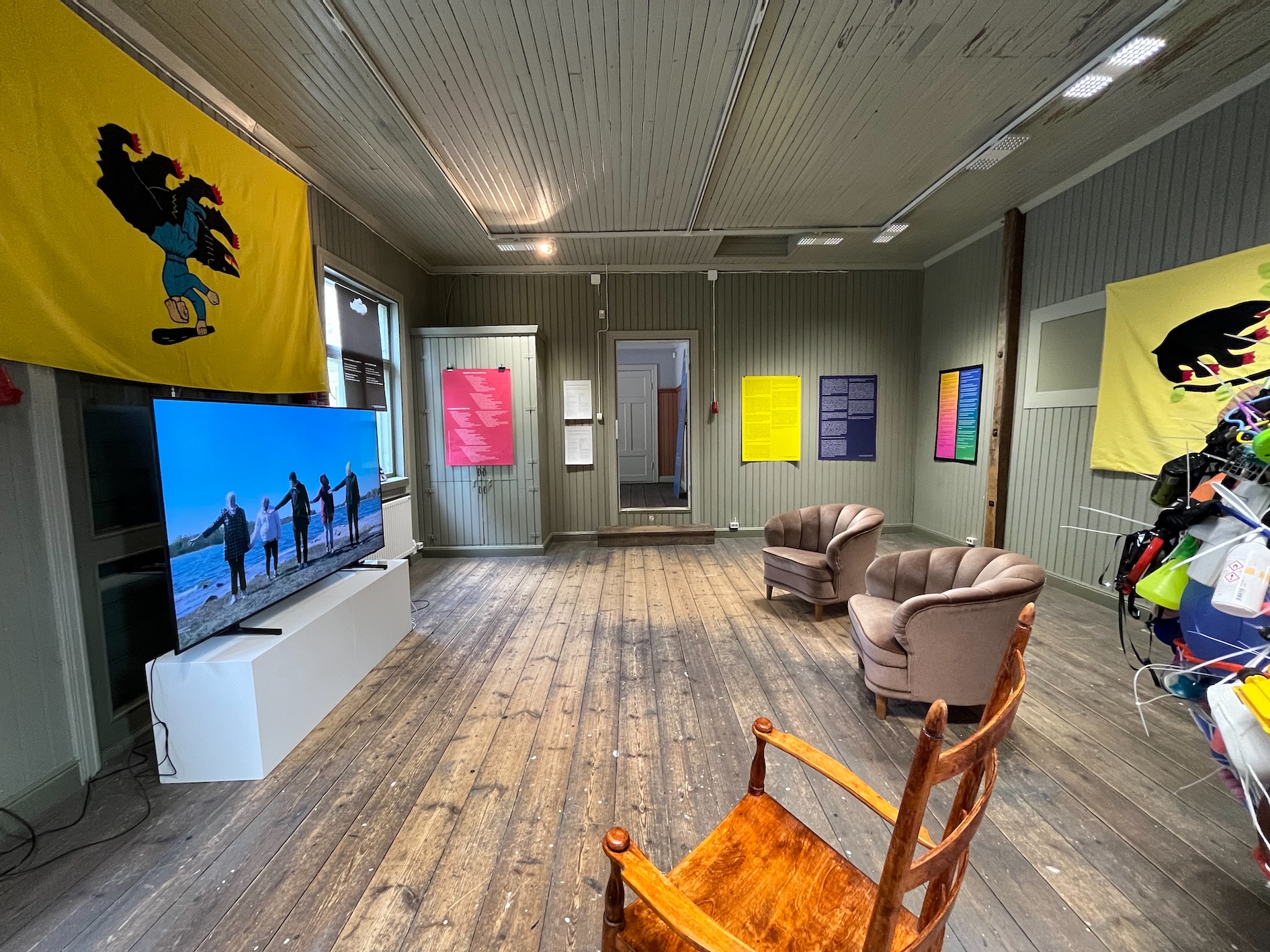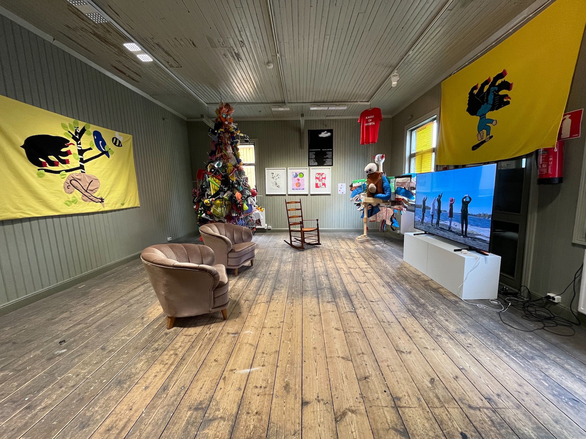 happiness. What comes after human species — or what could humans learn from for example birch trees? — I made the first version of this work for the Rauma Triennale in Rauma Art Museum in Finland in 2022. It was a collaborative work with artists, art students and amateurs. I have since then continued working on this project on my own, expanding it and exhibiting various fragments of it in my exhibitions. The installation consists of drawings, flags, sculptures, posters, texts, music and 16 short films (total duration of those is 80 minutes). — This installation work is very flexible. Some times I've exhibited only a couple of fragments of it, for example a sculptural element with a few posters with texts. And sometimes I've shown only the short films or only a few of them. This flexibility is an integral part of the artistic method used in this project: my intention has been to create a work that can easily be updated and a work that can be expanded or condensed to fit a multitude of spaces and contexts. — The starting point of the work is Richard Strauss's Metamorphosen (1944–1945), which he composed at the end of the Second World War as an elegy to the civilization that he thought had collapsed under Nazism and the war. The composition is an obituary to what was destroyed, but it's also an attempt to imagine new life that can rise from the ruins. Because human kind is now, in 2022, facing self-inflicted catastrophes that are even bigger than the World Wars, we should stop to think what is it that we actually are and what do we want to become — through some kind of metamorphosis. Here's a link to video overview of what it looked like in Rauma Triennale 2022. After the triennale I've exhibited updated parts of the installation in Tallinn (Estonia), Vilnius (Lithuania), Tampere (Finland) and Kajaani (Finland). |