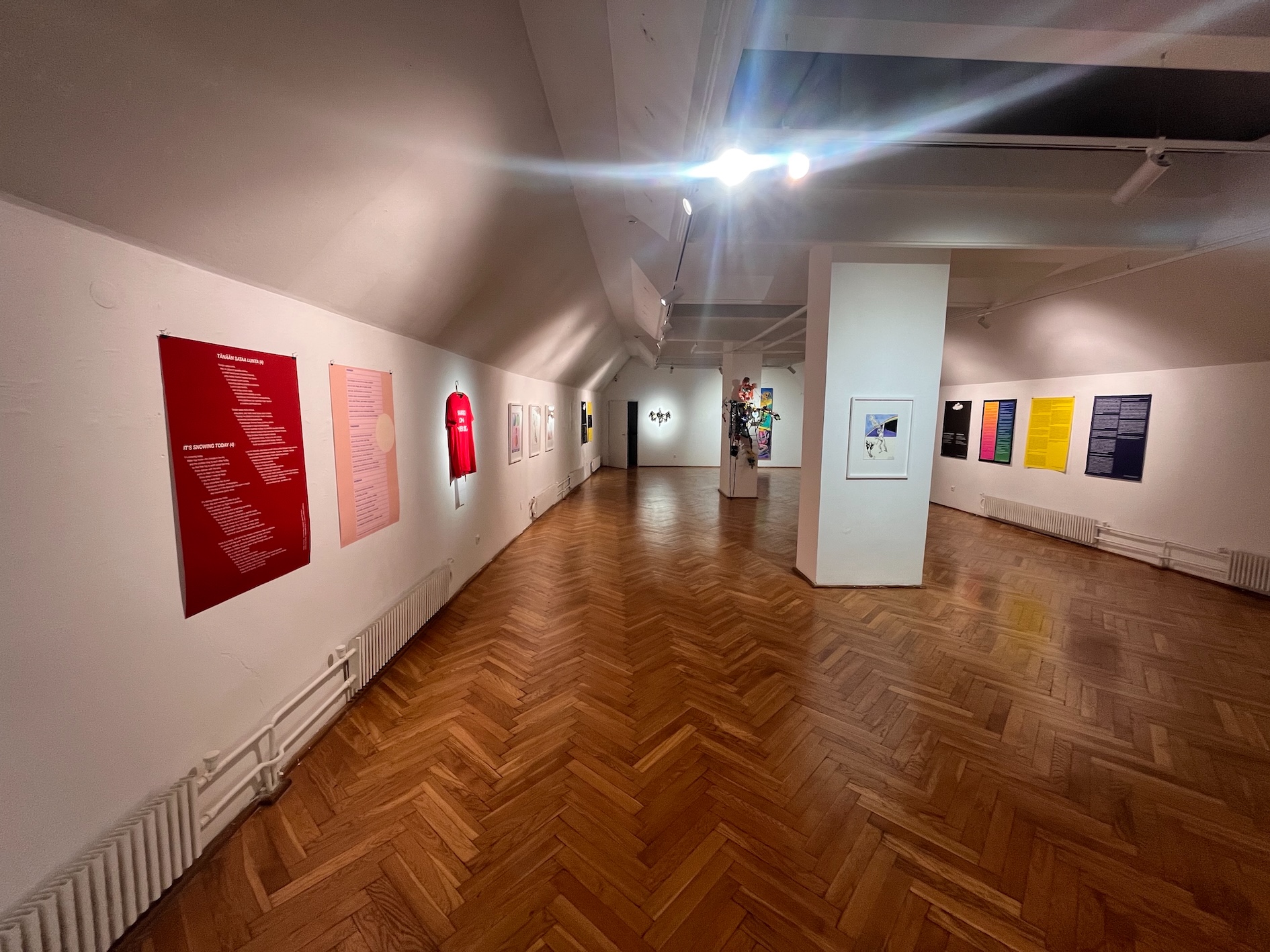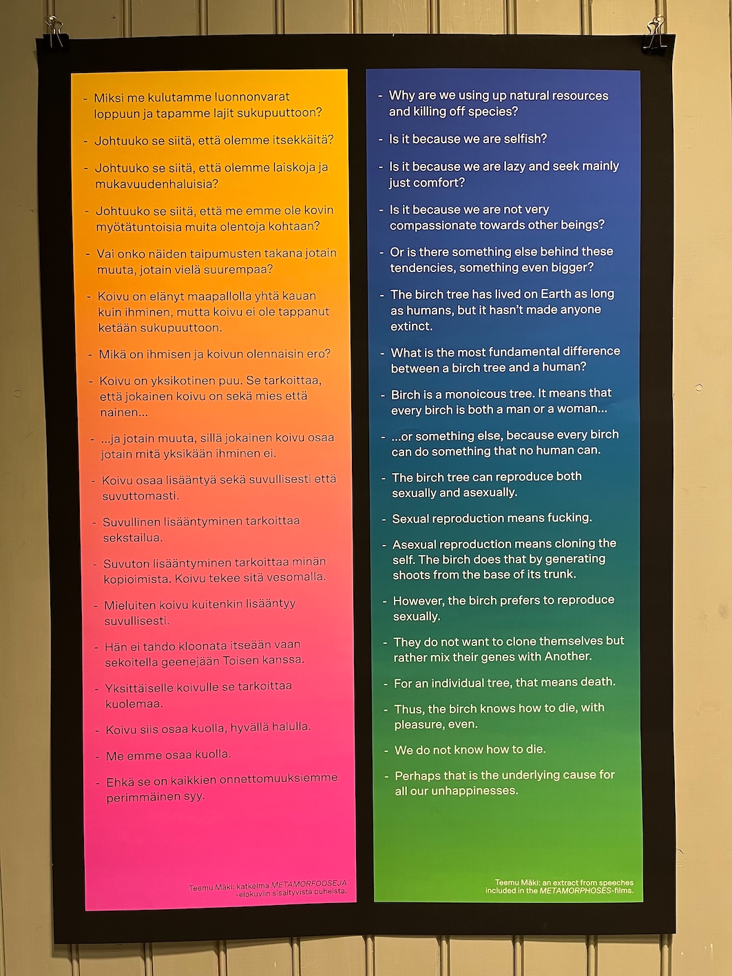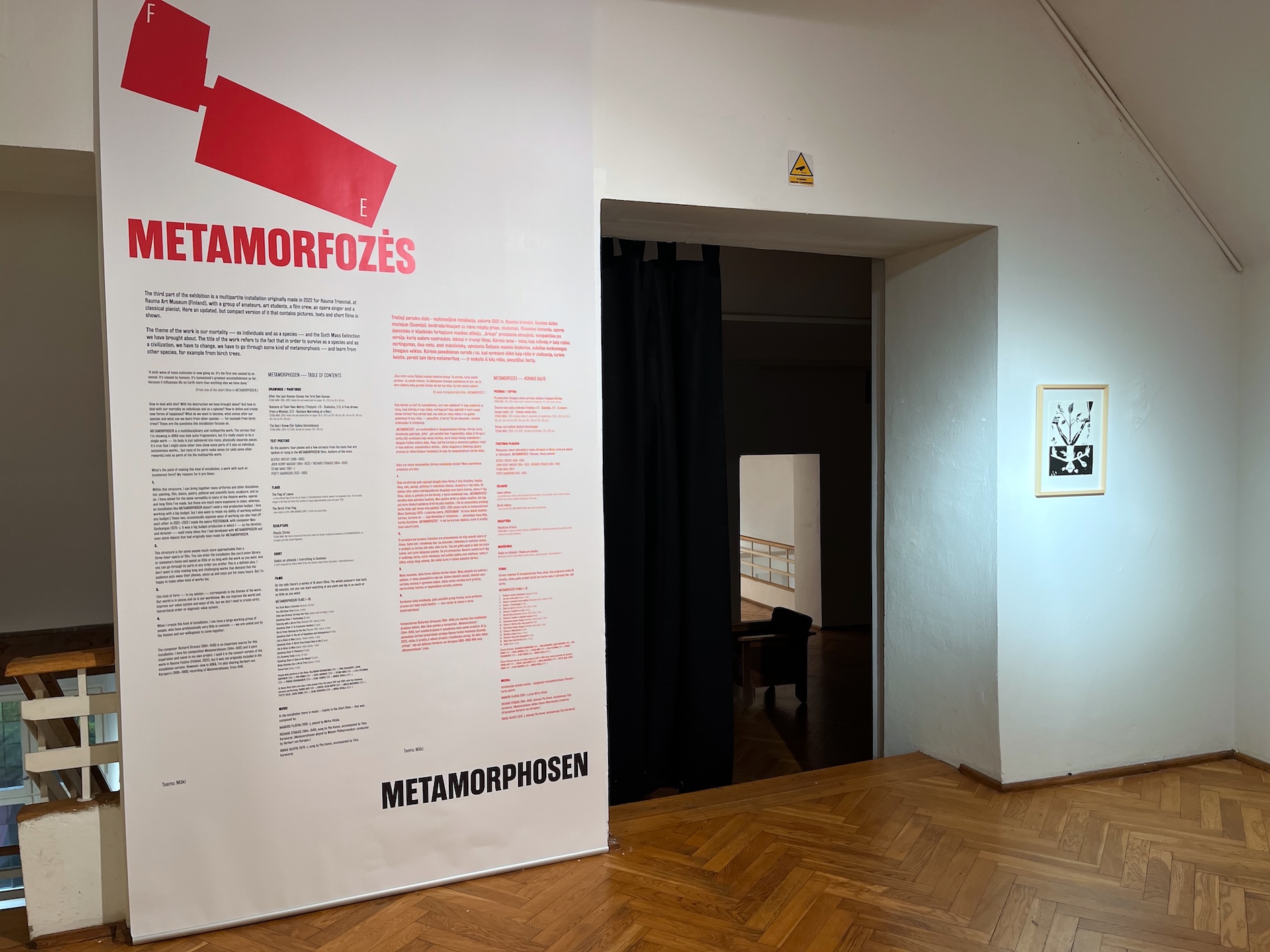 happiness. What comes after human species — or what could humans learn from for example birch trees? — I made the first version of this work for the Rauma Triennale in Rauma Art Museum in Finland in 2022. It was a collaborative work with artists, art students and amateurs. I have since then continued working on this project on my own, expanding it and exhibiting various fragments of it in my exhibitions. The installation consists of drawings, flags, sculptures, posters, texts, music and 16 short films (total duration of those is 80 minutes). — This installation work is very flexible. Some times I've exhibited only a couple of fragments of it, for example a sculptural element with a few posters with texts. And sometimes I've shown only the short films or only a few of them. This flexibility is an integral part of the artistic method used in this project: my intention has been to create a work that can easily be updated and a work that can be expanded or condensed to fit a multitude of spaces and contexts. — The starting point of the work is Richard Strauss's Metamorphosen (1944–1945), which he composed at the end of the Second World War as an elegy to the civilization that he thought had collapsed under Nazism and the war. The composition is an obituary to what was destroyed, but it's also an attempt to imagine new life that can rise from the ruins. Because human kind is now, in 2022, facing self-inflicted catastrophes that are even bigger than the World Wars, we should stop to think what is it that we actually are and what do we want to become — through some kind of metamorphosis. Here's a link to video overview of what it looked like in Rauma Triennale 2022. After the triennale I've exhibited updated parts of the installation in Tallinn (Estonia), Vilnius (Lithuania), Tampere (Finland) and Kajaani (Finland). |